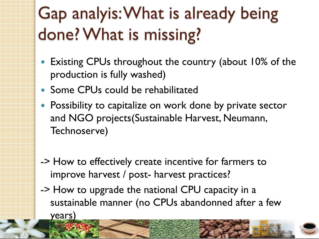 Gap analyis: Whatisalreadybeingdone? Whatismissing? • ExistingCPUsthroughout the country (about 10% of the production isfullywashed) • SomeCPUscouldberehabilitated • Possibility to capitalize on workdone by privatesector and NGO projects(SustainableHarvest, Neumann, Technoserve) -> How to effectivelycreateincentive for farmers to improveharvest / post- harvest practices? -> How to upgrade the national CPU capacity in a sustainablemanner (no CPUsabandonnedafter a few years)