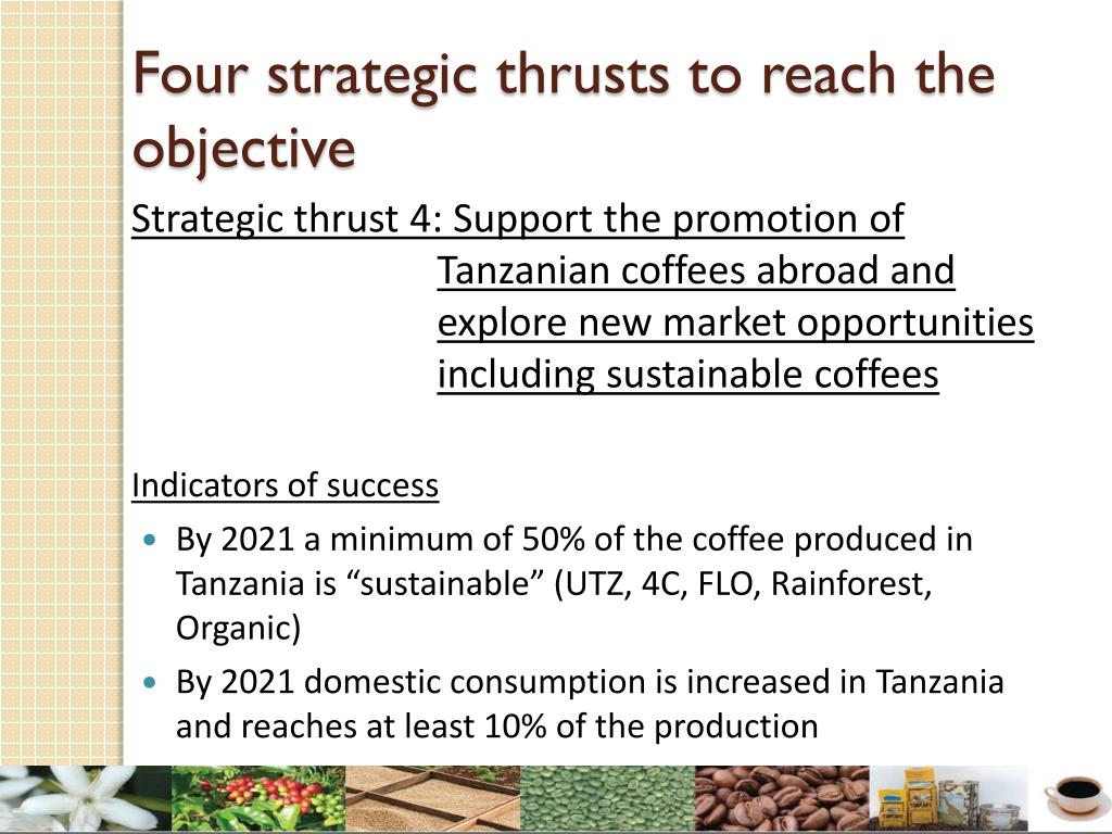 Four strategicthrusts to reach the objective Strategic thrust 4: Support the promotion of Tanzanian coffees abroad and explore new market opportunities including sustainable coffees Indicators of success • By 2021 a minimum of 50% of the coffee produced in Tanzania is “sustainable” (UTZ, 4C, FLO, Rainforest, Organic) • By 2021 domestic consumption is increased in Tanzania and reaches at least 10% of the production
