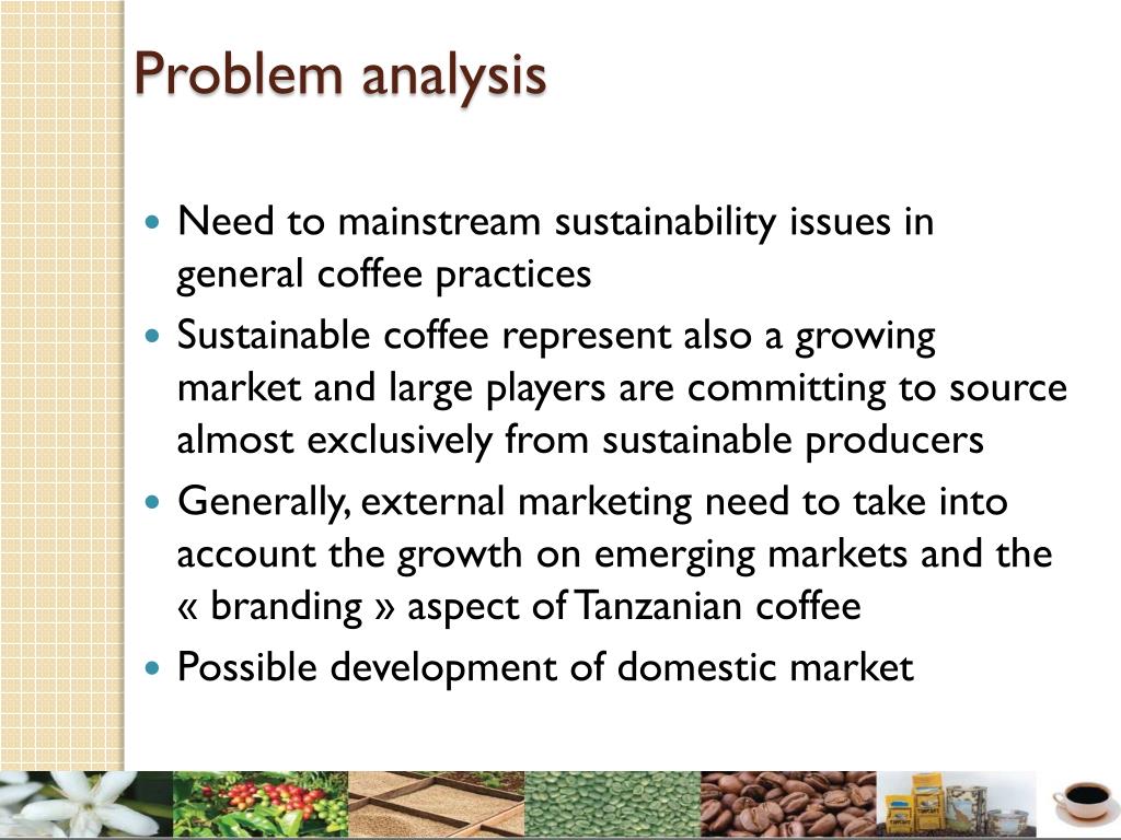 Problemanalysis • Need to mainstreamsustainability issues in general coffee practices • Sustainable coffee representalso a growingmarket and large players are committing to source almostexclusivelyfromsustainableproducers • Generally, external marketing need to takeintoaccount the growth on emergingmarkets and the « branding » aspect of Tanzanian coffee • Possible development of domesticmarket