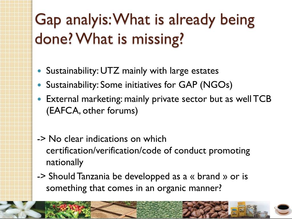 Gap analyis: Whatisalreadybeingdone? Whatismissing? • Sustainability: UTZ mainlywith large estates • Sustainability: Some initiatives for GAP (NGOs) • External marketing: mainlyprivatesector but as well TCB (EAFCA, other forums) -> No clear indications on which certification/verification/code of conductpromotingnationally -> Should Tanzania bedevelopped as a « brand » or issomethingthatcomes in an organicmanner?