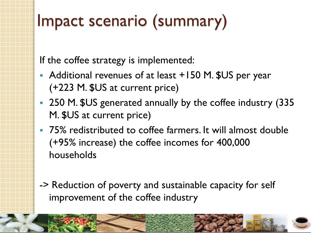 Impact scenario (summary) If the coffee strategy is implemented: • Additional revenues of at least +150 M. $US per year (+223 M. $US at current price) • 250 M. $US generated annually by the coffee industry (335 M. $US at current price) • 75% redistributed to coffee farmers. It will almost double (+95% increase) the coffee incomes for 400,000 households -> Reduction of poverty and sustainable capacity for self improvement of the coffee industry