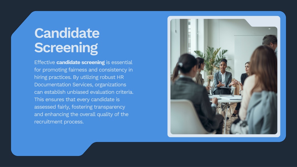 5. Candidate Screening • Effective candidate screening is essential for promoting fairness and consistency in hiring practices. By utilizing robust HR Documentation Services, organizations can establish unbiased evaluation criteria. This ensures that every candidate is assessed fairly, fostering transparency and enhancing the overall quality of the recruitment process.