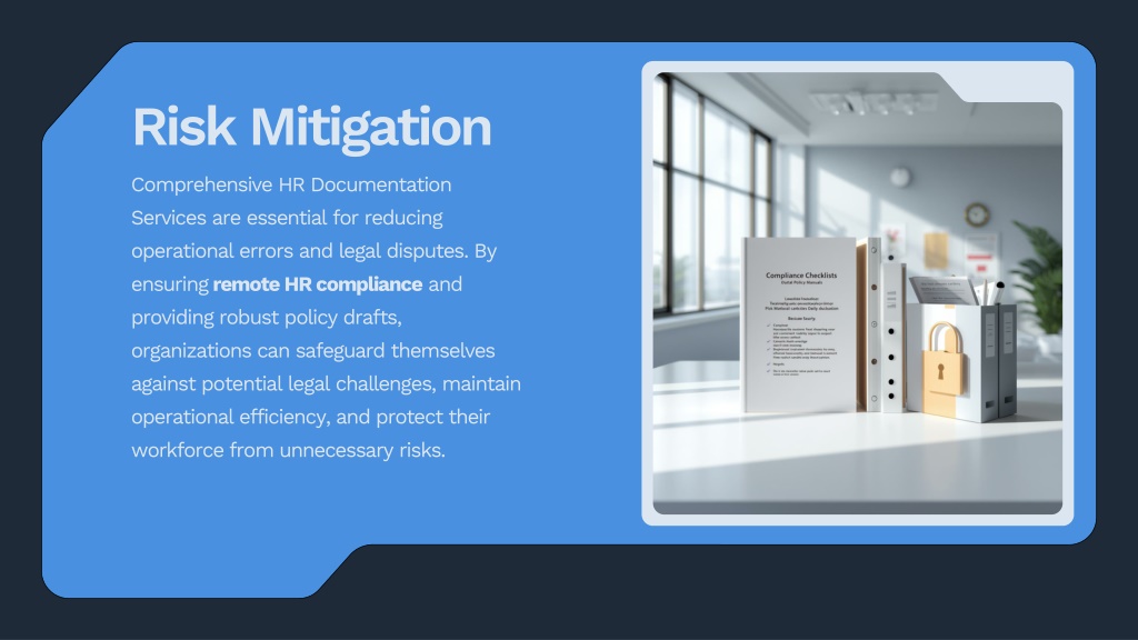 7. Risk Mitigation • Comprehensive HR Documentation Services are essential for reducing operational errors and legal disputes. By ensuring remote HR compliance and providing robust policy drafts, organizations can safeguard themselves against potential legal challenges, maintain operational efficiency, and protect their workforce from unnecessary risks.