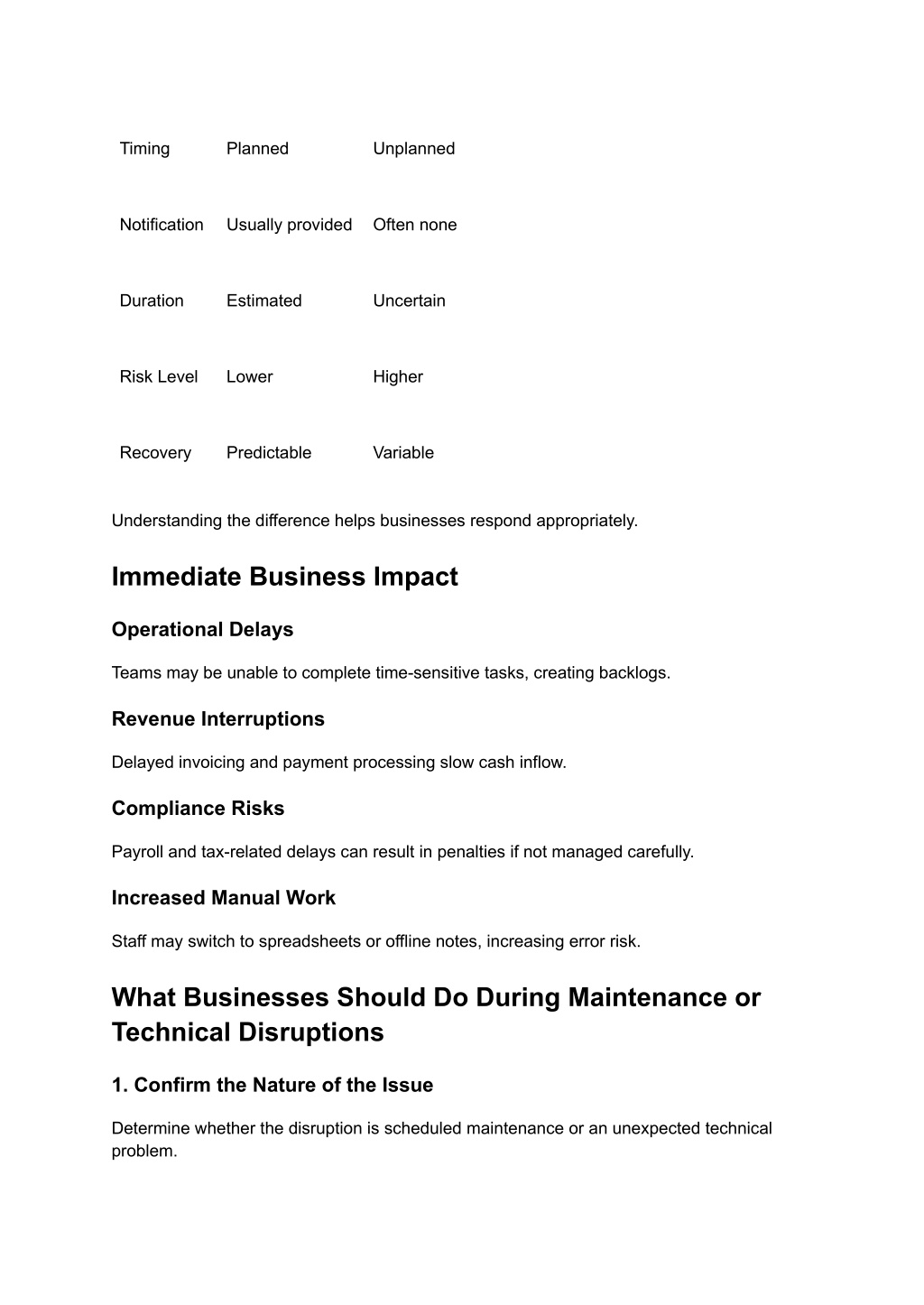 Timing Planned Unplanned Notification Usually provided Often none Duration Estimated Uncertain Risk Level Lower Higher Recovery Predictable Variable Understanding the difference helps businesses respond appropriately. Immediate Business Impact Operational Delays Teams may be unable to complete time-sensitive tasks, creating backlogs. Revenue Interruptions Delayed invoicing and payment processing slow cash inflow. Compliance Risks Payroll and tax-related delays can result in penalties if not managed carefully. Increased Manual Work Staff may switch to spreadsheets or offline notes, increasing error risk. What Businesses Should Do During Maintenance or Technical Disruptions 1. Confirm the Nature of the Issue Determine whether the disruption is scheduled maintenance or an unexpected technical problem.