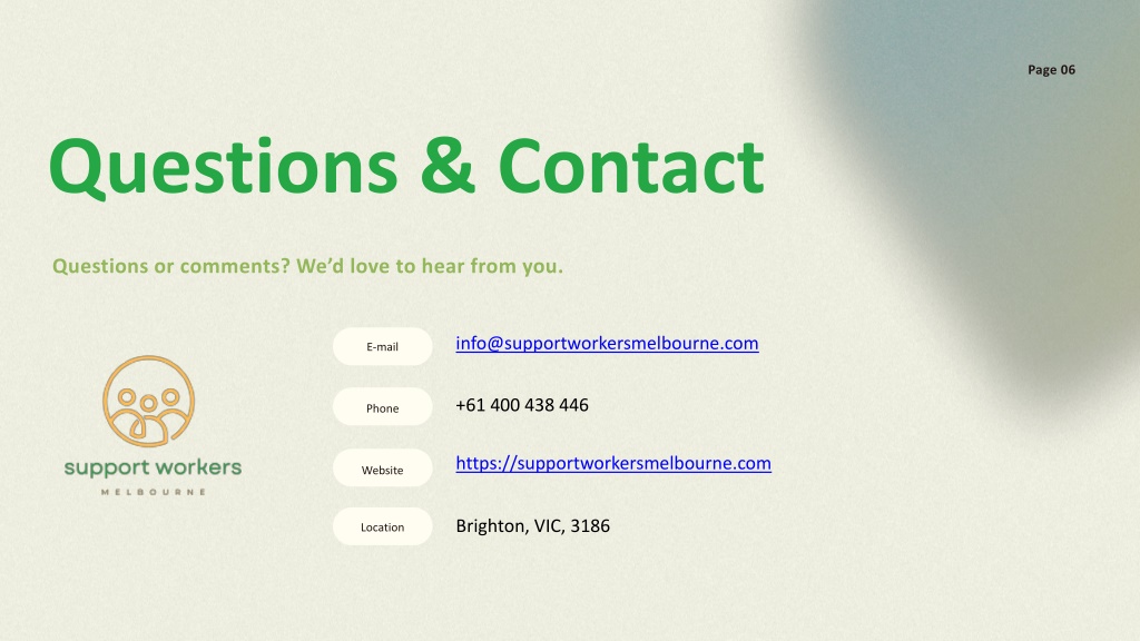 6. E-mail Location Phone Website Page 06 Questions & Contact Questions or comments? We’d love to hear from you. info@supportworkersmelbourne.com +61 400 438 446 https://supportworkersmelbourne.com Brighton, VIC, 3186