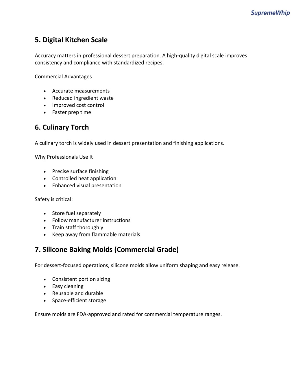 5. Digital Kitchen Scale Accuracy matters in professional dessert preparation. A high-quality digital scale improves consistency and compliance with standardized recipes. Commercial Advantages Accurate measurements Reduced ingredient waste Improved cost control Faster prep time 6. Culinary Torch A culinary torch is widely used in dessert presentation and finishing applications. Why Professionals Use It Precise surface finishing Controlled heat application Enhanced visual presentation Safety is critical: Store fuel separately Follow manufacturer instructions Train staff thoroughly Keep away from flammable materials 7. Silicone Baking Molds (Commercial Grade) For dessert-focused operations, silicone molds allow uniform shaping and easy release. Consistent portion sizing Easy cleaning Reusable and durable Space-efficient storage Ensure molds are FDA-approved and rated for commercial temperature ranges.