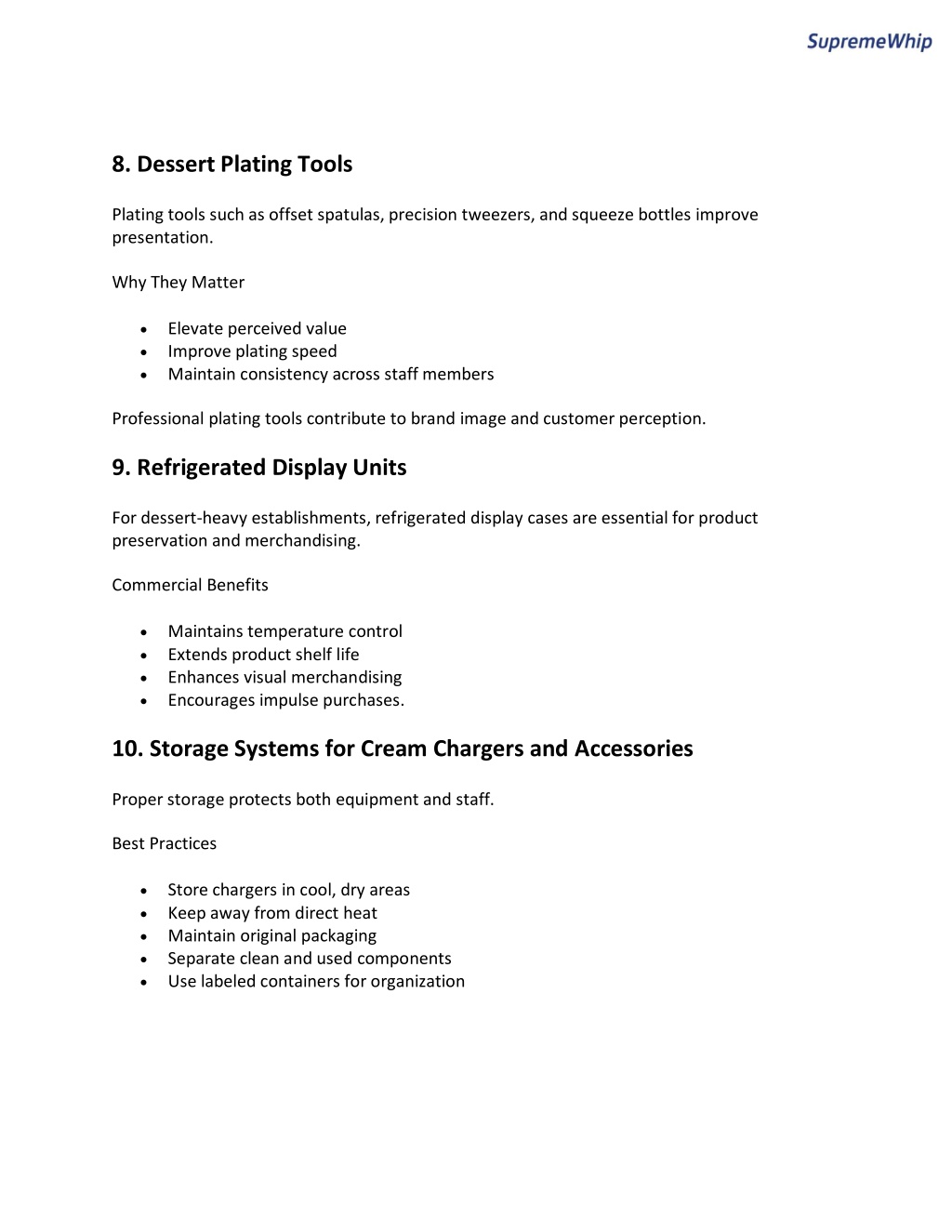 8. Dessert Plating Tools Plating tools such as offset spatulas, precision tweezers, and squeeze bottles improve presentation. Why They Matter Elevate perceived value Improve plating speed Maintain consistency across staff members Professional plating tools contribute to brand image and customer perception. 9. Refrigerated Display Units For dessert-heavy establishments, refrigerated display cases are essential for product preservation and merchandising. Commercial Benefits Maintains temperature control Extends product shelf life Enhances visual merchandising Encourages impulse purchases. 10. Storage Systems for Cream Chargers and Accessories Proper storage protects both equipment and staff. Best Practices Store chargers in cool, dry areas Keep away from direct heat Maintain original packaging Separate clean and used components Use labeled containers for organization