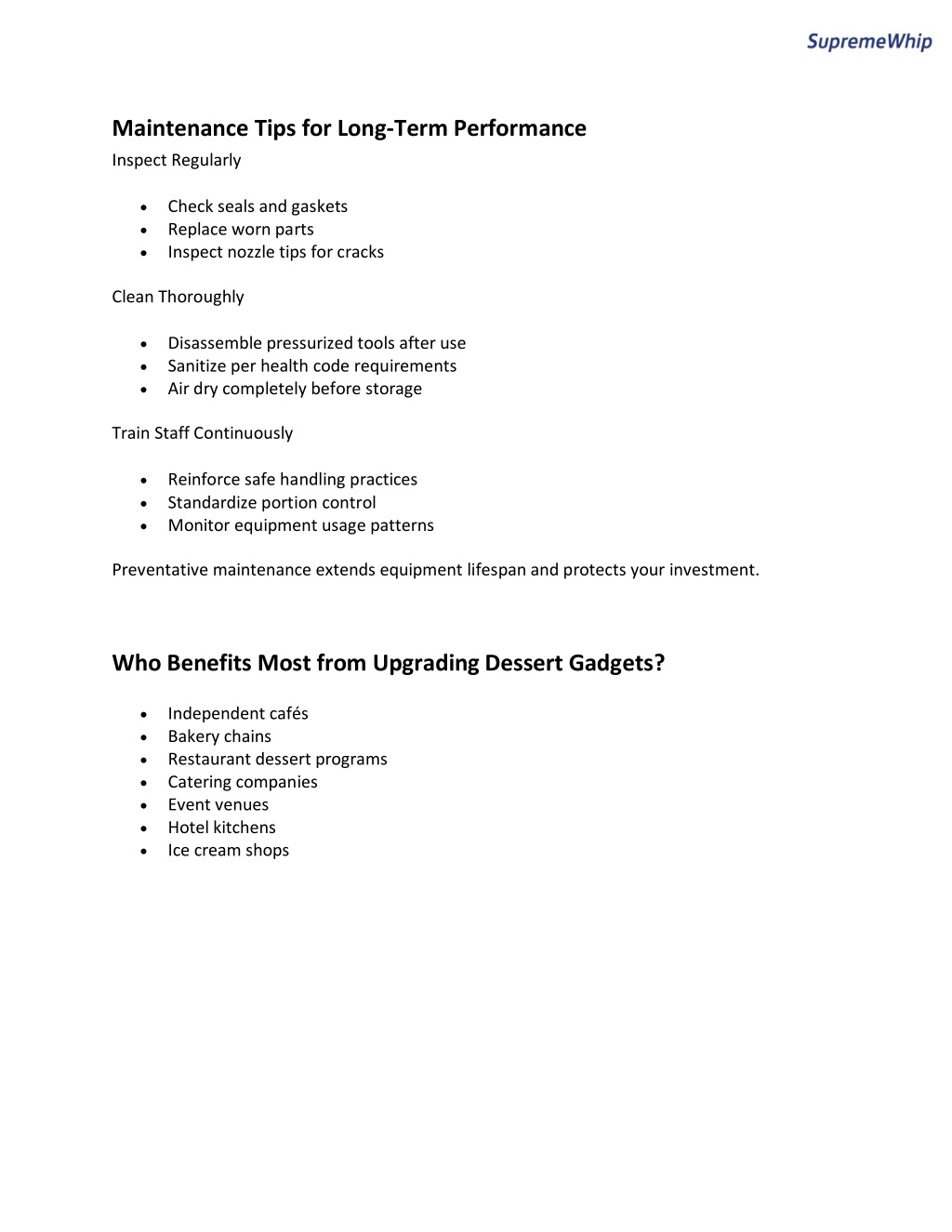 Reducing Waste Through Proper Equipment The right gadgets minimize waste by: Improving portion accuracy Reducing over-dispensing Preventing leaks in pressurized systems Maintaining temperature stability Ensuring consistent output Even small efficiency gains significantly impact monthly profit margins. How to Choose the Right Supplier When sourcing dessert gadgets and charger systems, consider: Product durability Food-grade certification Replacement part availability Customer support Shipping reliability Bulk pricing options Reliable distributors such Supreme Whip offer professional-grade solutions tailored to commercial dessert operations. Building a Professional Dessert Station An optimized dessert station should include: Commercial whipped cream dispenser Cream charger starter pack Multiple nozzle tip options Organized charger storage Portion control tools Sanitized cleaning brushes Backup replacement parts This setup reduces downtime and ensures uninterrupted service.