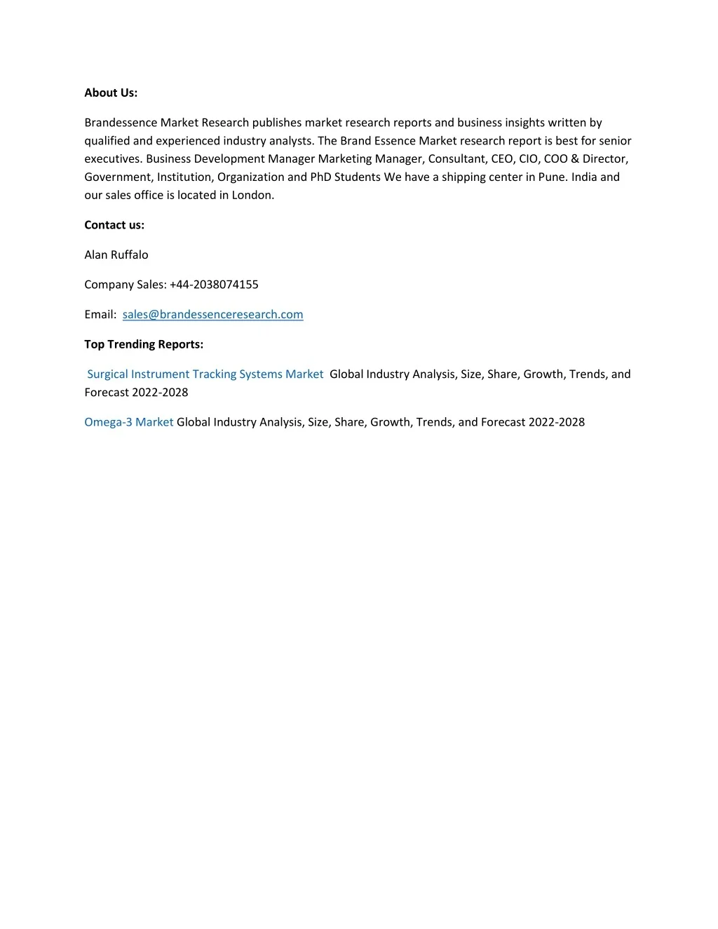 About Us: Brandessence Market Research publishes market research reports and business insights written by qualified and experienced industry analysts. The Brand Essence Market research report is best for senior executives. Business Development Manager Marketing Manager, Consultant, CEO, CIO, COO & Director, Government, Institution, Organization and PhD Students We have a shipping center in Pune. India and our sales office is located in London. Contact us: Alan Ruffalo Company Sales: +44-2038074155 Email: sales@brandessenceresearch.com Top Trending Reports: Surgical Instrument Tracking Systems Market Global Industry Analysis, Size, Share, Growth, Trends, and Forecast 2022-2028 Omega-3 Market Global Industry Analysis, Size, Share, Growth, Trends, and Forecast 2022-2028