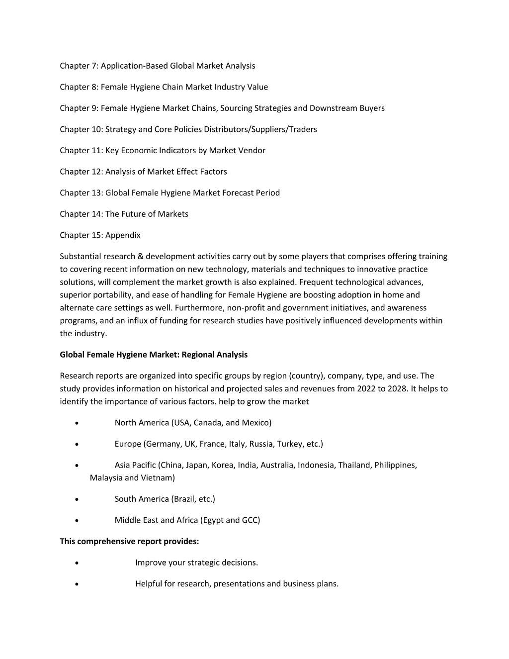 Chapter 7: Application-Based Global Market Analysis Chapter 8: Female Hygiene Chain Market Industry Value Chapter 9: Female Hygiene Market Chains, Sourcing Strategies and Downstream Buyers Chapter 10: Strategy and Core Policies Distributors/Suppliers/Traders Chapter 11: Key Economic Indicators by Market Vendor Chapter 12: Analysis of Market Effect Factors Chapter 13: Global Female Hygiene Market Forecast Period Chapter 14: The Future of Markets Chapter 15: Appendix Substantial research & development activities carry out by some players that comprises offering training to covering recent information on new technology, materials and techniques to innovative practice solutions, will complement the market growth is also explained. Frequent technological advances, superior portability, and ease of handling for Female Hygiene are boosting adoption in home and alternate care settings as well. Furthermore, non-profit and government initiatives, and awareness programs, and an influx of funding for research studies have positively influenced developments within the industry. Global Female Hygiene Market: Regional Analysis Research reports are organized into specific groups by region (country), company, type, and use. The study provides information on historical and projected sales and revenues from 2022 to 2028. It helps to identify the importance of various factors. help to grow the market • North America (USA, Canada, and Mexico) • Europe (Germany, UK, France, Italy, Russia, Turkey, etc.) • Asia Pacific (China, Japan, Korea, India, Australia, Indonesia, Thailand, Philippines, Malaysia and Vietnam) • South America (Brazil, etc.) • Middle East and Africa (Egypt and GCC) This comprehensive report provides: • Improve your strategic decisions. • Helpful for research, presentations and business plans.
