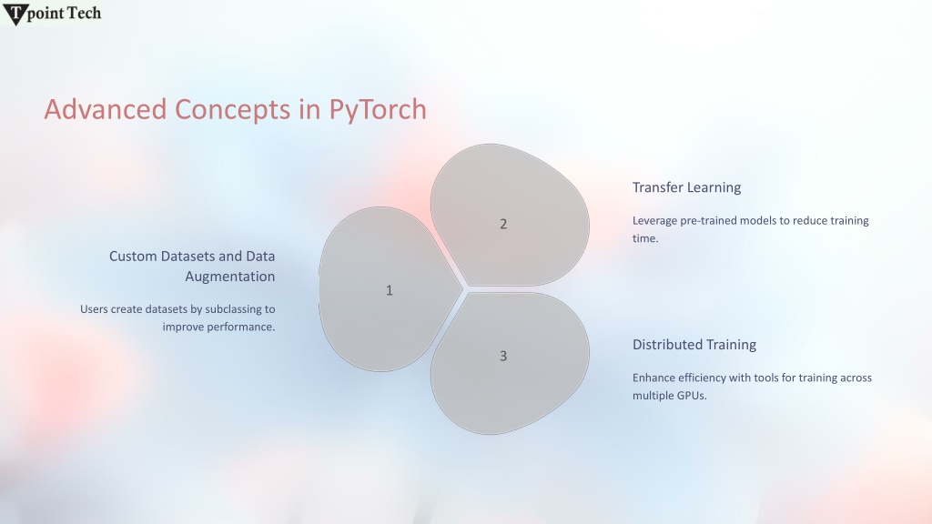 Advanced Concepts in PyTorch Transfer Learning Leverage pre-trained models to reduce training time. 2 Custom Datasets and Data Augmentation 1 Users create datasets by subclassing to improve performance. Distributed Training 3 Enhance efficiency with tools for training across multiple GPUs.