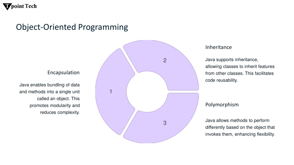 Object-Oriented Programming Inheritance Java supports inheritance, allowing classes to inherit features from other classes. This facilitates code reusability. 2 Encapsulation Java enables bundling of data and methods into a single unit called an object. This promotes modularity and reduces complexity. 1 Polymorphism Java allows methods to perform differently based on the object that invokes them, enhancing flexibility. 3
