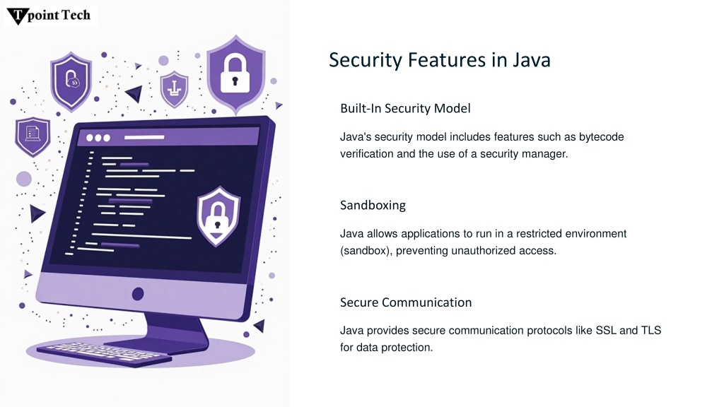 Security Features in Java Built-In Security Model Java's security model includes features such as bytecode verification and the use of a security manager. Sandboxing Java allows applications to run in a restricted environment (sandbox), preventing unauthorized access. Secure Communication Java provides secure communication protocols like SSL and TLS for data protection.