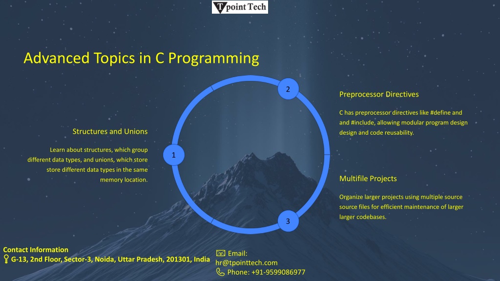 Advanced Topics in C Programming 2 Preprocessor Directives C has preprocessor directives like #define and #include, allowing modular program design and code reusability. Structures and Unions Learn about structures, which group different data types, and unions, which store different data types in the same memory location. 1 Multifile Projects Organize larger projects using multiple source files for efficient maintenance of larger codebases. 3 Contact Information📍 G-13, 2nd Floor, Sector-3, Noida, Uttar Pradesh, 201301, India 📧 Email: hr@tpointtech.com📞 Phone: +91-9599086977