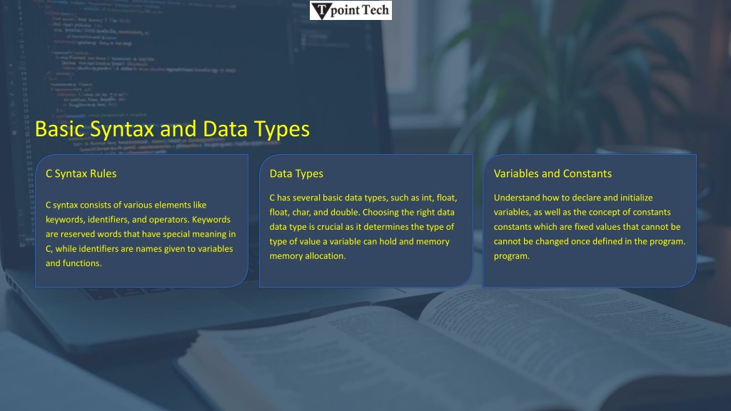 Basic Syntax and Data Types C Syntax Rules Data Types Variables and Constants C syntax consists of various elements like keywords, identifiers, and operators. Keywords are reserved words that have special meaning in C, while identifiers are names given to variables and functions. C has several basic data types, such as int, float, char, and double. Choosing the right data type is crucial as it determines the type of value a variable can hold and memory allocation. Understand how to declare and initialize variables, as well as the concept of constants which are fixed values that cannot be changed once defined in the program.