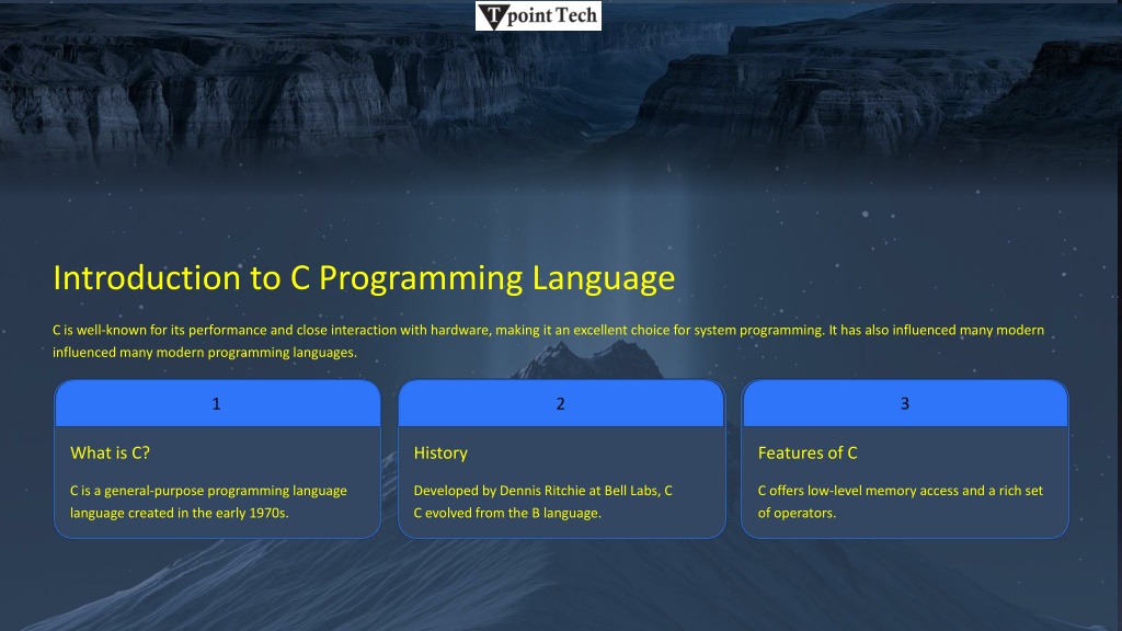 Introduction to C Programming Language C is well-known for its performance and close interaction with hardware, making it an excellent choice for system programming. It has also influenced many modern programming languages. 1 2 3 What is C? History Features of C C is a general-purpose programming language created in the early 1970s. Developed by Dennis Ritchie at Bell Labs, C evolved from the B language. C offers low-level memory access and a rich set of operators.