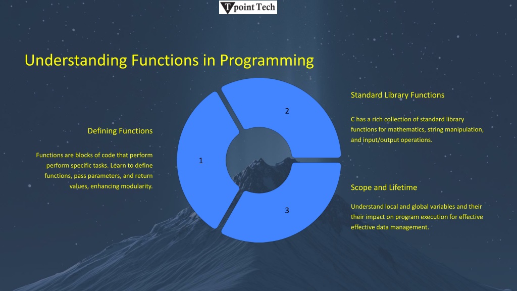 Understanding Functions in Programming Standard Library Functions 2 C has a rich collection of standard library functions for mathematics, string manipulation, and input/output operations. Defining Functions Functions are blocks of code that perform specific tasks. Learn to define functions, pass parameters, and return values, enhancing modularity. 1 Scope and Lifetime Understand local and global variables and their impact on program execution for effective data management. 3