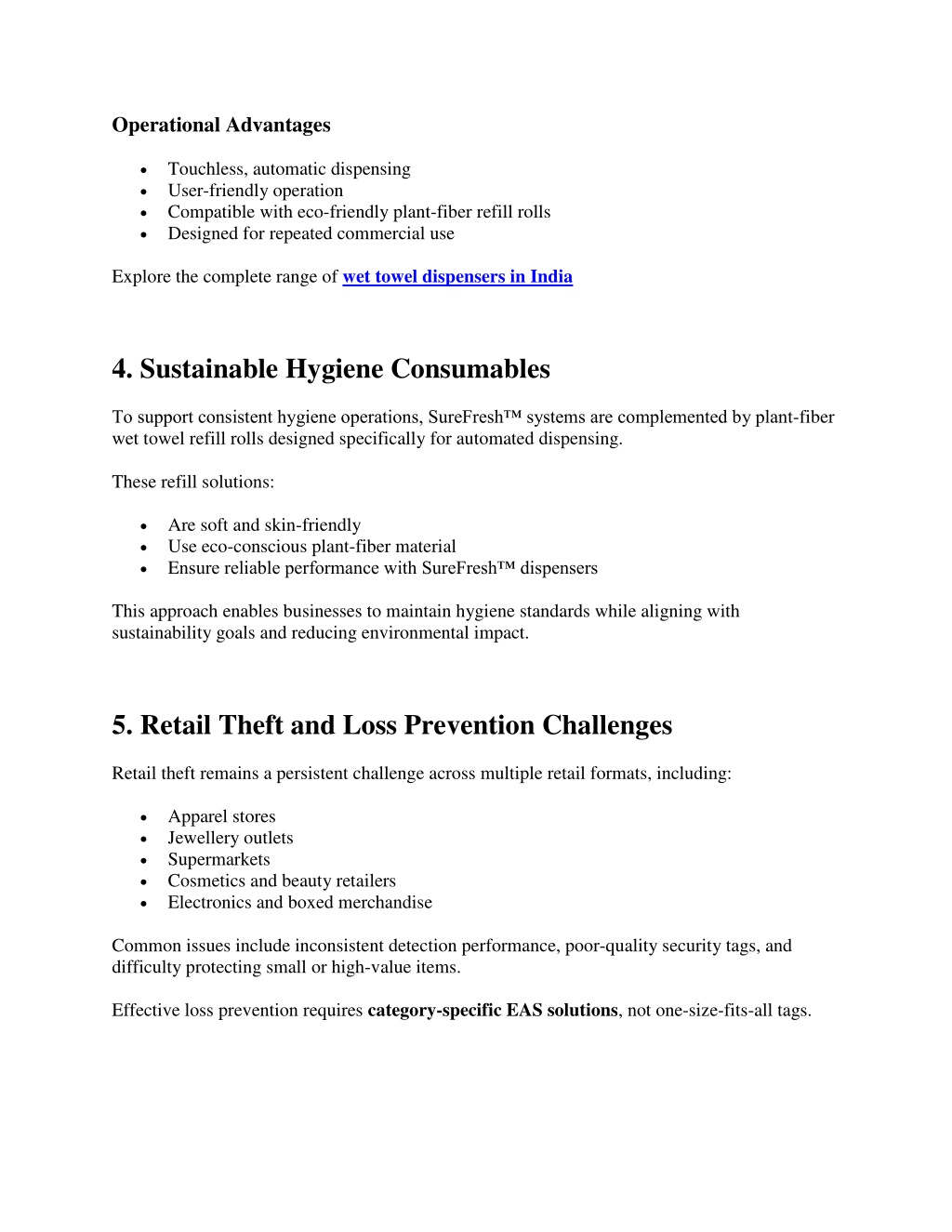 3. Operational Advantages Touchless, automatic dispensing User-friendly operation Compatible with eco-friendly plant-fiber refill rolls Designed for repeated commercial use Explore the complete range of wet towel dispensers in India 4. Sustainable Hygiene Consumables To support consistent hygiene operations, SureFresh™ systems are complemented by plant-fiber wet towel refill rolls designed specifically for automated dispensing. These refill solutions: Are soft and skin-friendly Use eco-conscious plant-fiber material Ensure reliable performance with SureFresh™ dispensers This approach enables businesses to maintain hygiene standards while aligning with sustainability goals and reducing environmental impact. 5. Retail Theft and Loss Prevention Challenges Retail theft remains a persistent challenge across multiple retail formats, including: Apparel stores Jewellery outlets Supermarkets Cosmetics and beauty retailers Electronics and boxed merchandise Common issues include inconsistent detection performance, poor-quality security tags, and difficulty protecting small or high-value items. Effective loss prevention requires category-specific EAS solutions, not one-size-fits-all tags.