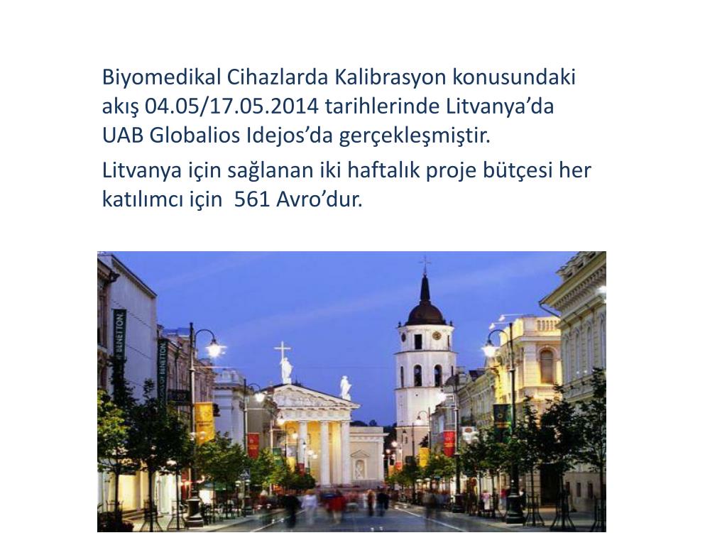 Biyomedikal Cihazlarda Kalibrasyon konusundaki akış 04.05/17.05.2014 tarihlerinde Litvanya’da UAB Globalios Idejos’da gerçekleşmiştir. Litvanya için sağlanan iki haftalık proje bütçesi her katılımcı için 561 Avro’dur. UAB GLOBAL IDEAS.