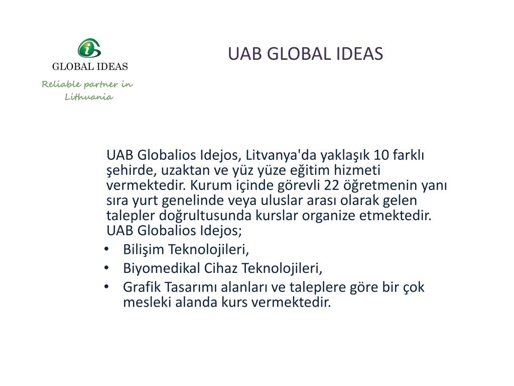UAB GLOBAL IDEAS UAB Globalios Idejos, Litvanya'da yaklaşık 10 farklı şehirde, uzaktan ve yüz yüze eğitim hizmeti vermektedir. Kurum içinde görevli 22 öğretmenin yanı sıra yurt genelinde veya uluslar arası olarak gelen talepler doğrultusunda kurslar organize etmektedir. UAB Globalios Idejos; Bilişim Teknolojileri, Biyomedikal Cihaz Teknolojileri, Grafik Tasarımı alanları ve taleplere göre bir çok mesleki alanda kurs vermektedir.