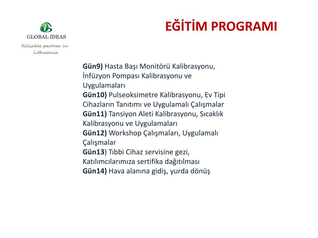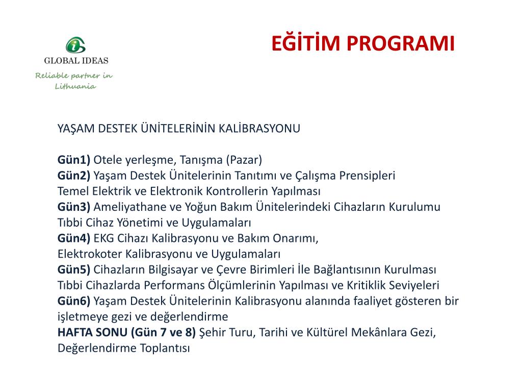 EĞİTİM PROGRAMI YAŞAM DESTEK ÜNİTELERİNİN KALİBRASYONU Gün1) Otele yerleşme, Tanışma (Pazar) Gün2) Yaşam Destek Ünitelerinin Tanıtımı ve Çalışma Prensipleri Temel Elektrik ve Elektronik Kontrollerin Yapılması Gün3) Ameliyathane ve Yoğun Bakım Ünitelerindeki Cihazların Kurulumu Tıbbi Cihaz Yönetimi ve Uygulamaları Gün4) EKG Cihazı Kalibrasyonu ve Bakım Onarımı, Elektrokoter Kalibrasyonu ve Uygulamaları Gün5) Cihazların Bilgisayar ve Çevre Birimleri İle Bağlantısının Kurulması Tıbbi Cihazlarda Performans Ölçümlerinin Yapılması ve Kritiklik Seviyeleri Gün6) Yaşam Destek Ünitelerinin Kalibrasyonu alanında faaliyet gösteren bir işletmeye gezi ve değerlendirme HAFTA SONU (Gün 7 ve 8) Şehir Turu, Tarihi ve Kültürel Mekânlara Gezi, Değerlendirme Toplantısı