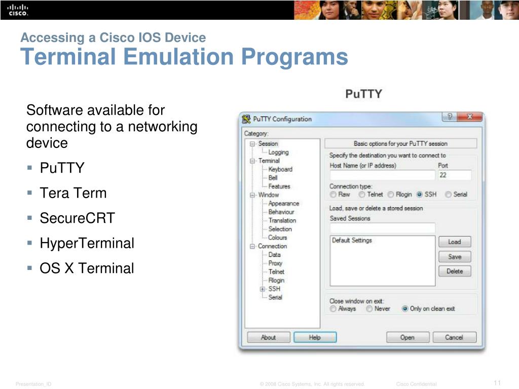 Accessing a Cisco IOS DeviceTerminal Emulation Programs Software available for connecting to a networking device • PuTTY • TeraTerm • SecureCRT • HyperTerminal • OS X Terminal
