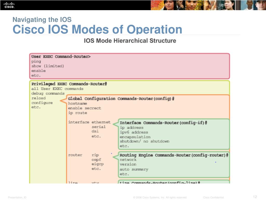 It Is Just an Operating SystemChapter 2 Summary • Services provided by the Cisco IOS accessed using a command-line interface (CLI) • accessed by either the console port, the AUX port, or through telnet or SSH • can make configuration changes to Cisco IOS devices • a network technician must navigate through various hierarchical modes of the IOS • Cisco IOS routers and switches support a similar operating system • Introduced the initial settings of a Cisco IOS switch device • setting a name • limiting access to the device configuration • configuring banner messages • saving the configuration