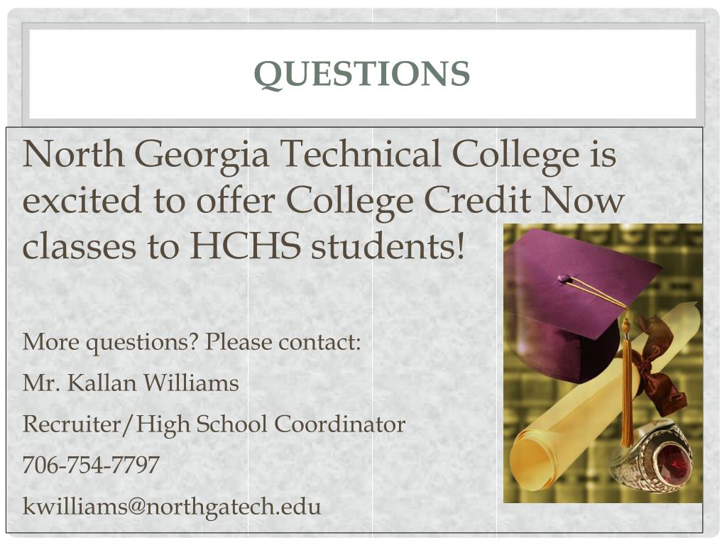Questions North Georgia Technical College is excited to offer College Credit Now classes to HCHS students! More questions? Please contact: Mr. Kallan Williams Recruiter/High School Coordinator 706-754-7797 kwilliams@northgatech.edu