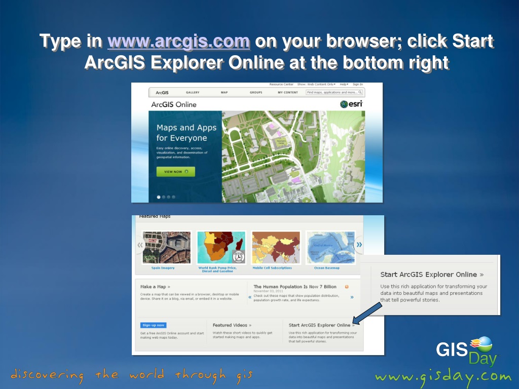 Type in www.arcgis.com on your browser; click Start ArcGIS Explorer Online at the bottom right