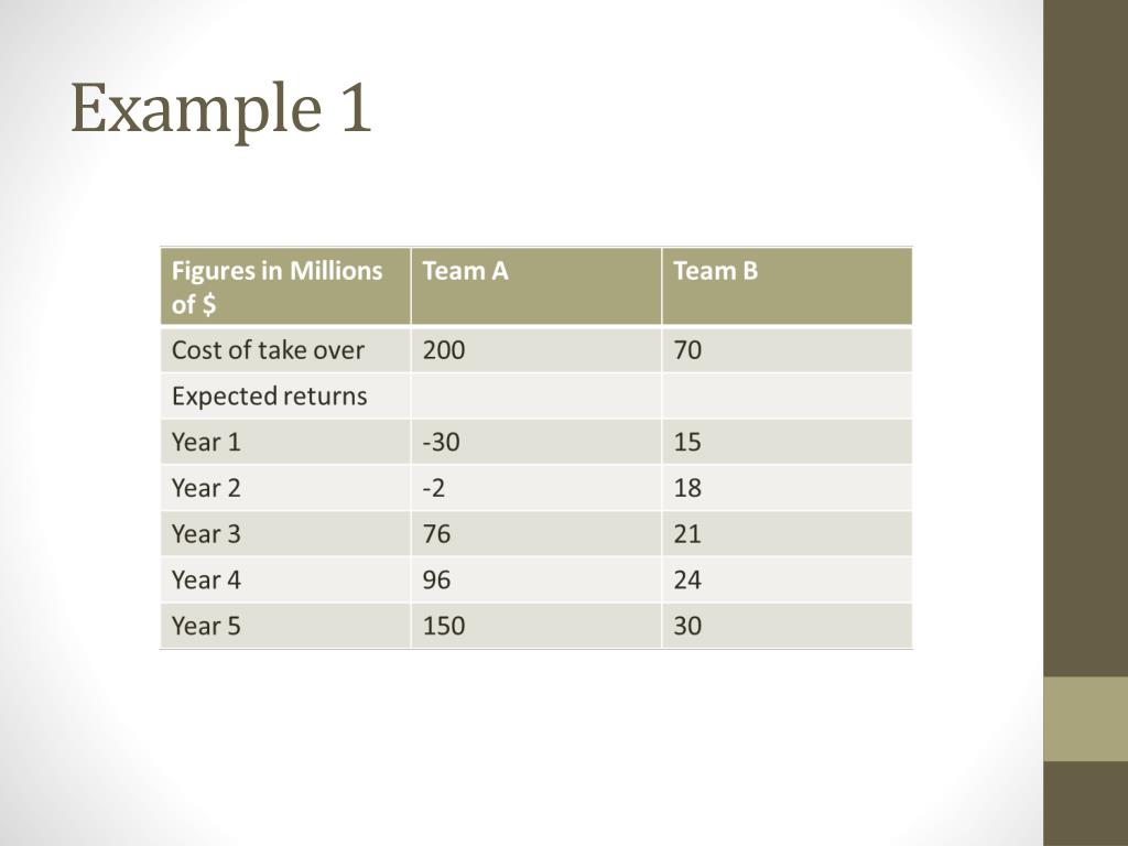 Example - ARR • Team A • Initial capital cost: $200m • Expected returns in year • 1: -30 • 2: -2 • 3: 76 • 4: 96 • 5: 150 • 29%