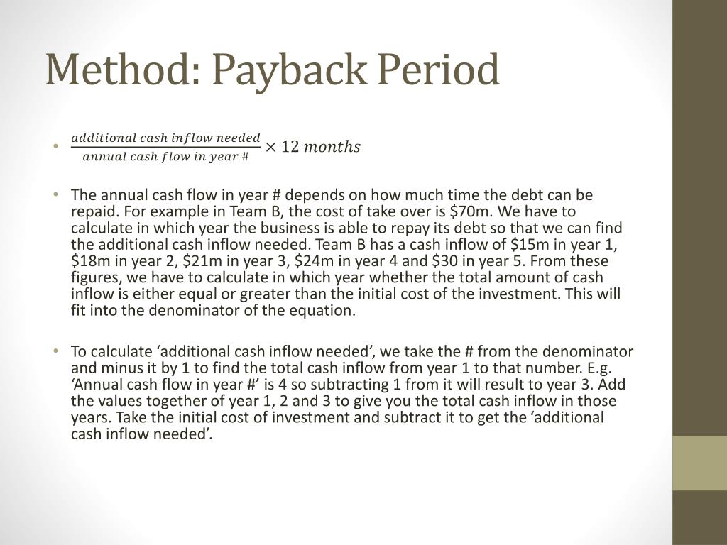 Method: Payback Period • The annual cash flow in year # depends on how much time the debt can be repaid. For example in Team B, the cost of take over is $70m. We have to calculate in which year the business is able to repay its debt so that we can find the additional cash inflow needed. Team B has a cash inflow of $15m in year 1, $18m in year 2, $21m in year 3, $24m in year 4 and $30 in year 5. From these figures, we have to calculate in which year whether the total amount of cash inflow is either equal or greater than the initial cost of the investment. This will fit into the denominator of the equation. • To calculate ‘additional cash inflow needed’, we take the # from the denominator and minus it by 1 to find the total cash inflow from year 1 to that number. E.g. ‘Annual cash flow in year #’ is 4 so subtracting 1 from it will result to year 3. Add the values together of year 1, 2 and 3 to give you the total cash inflow in those years. Take the initial cost of investment and subtract it to get the ‘additional cash inflow needed’.