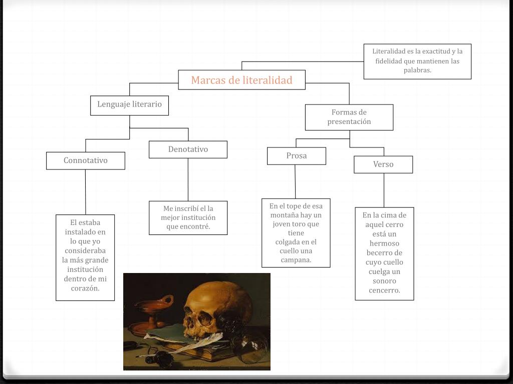 Literalidad es la exactitud y la fidelidad que mantienen laspalabras. Marcas de literalidad Lenguaje literario Formas de presentación Denotativo Prosa Connotativo Verso En el tope de esa montaña hay un joven toro que tiene colgada en el cuello una campana. Me inscribí el la mejor institución que encontré. En la cima de aquel cerro está un hermoso becerro de cuyo cuello cuelga un sonoro cencerro. El estaba instalado en lo que yo consideraba la más grande institución dentro de mi corazón.