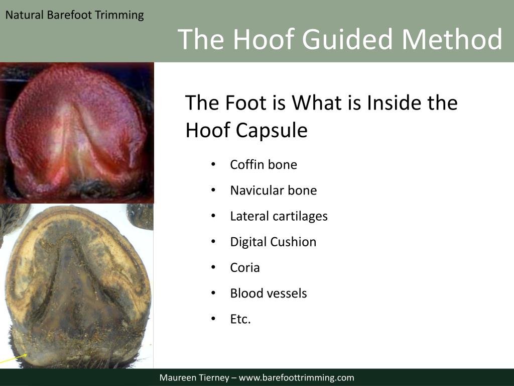 Natural Barefoot Trimming The Hoof Guided Method The Hoof versus The Foot The horse has both a foot and a hoof capsule. We need to consider both. Maureen Tierney – www.barefoottrimming.com