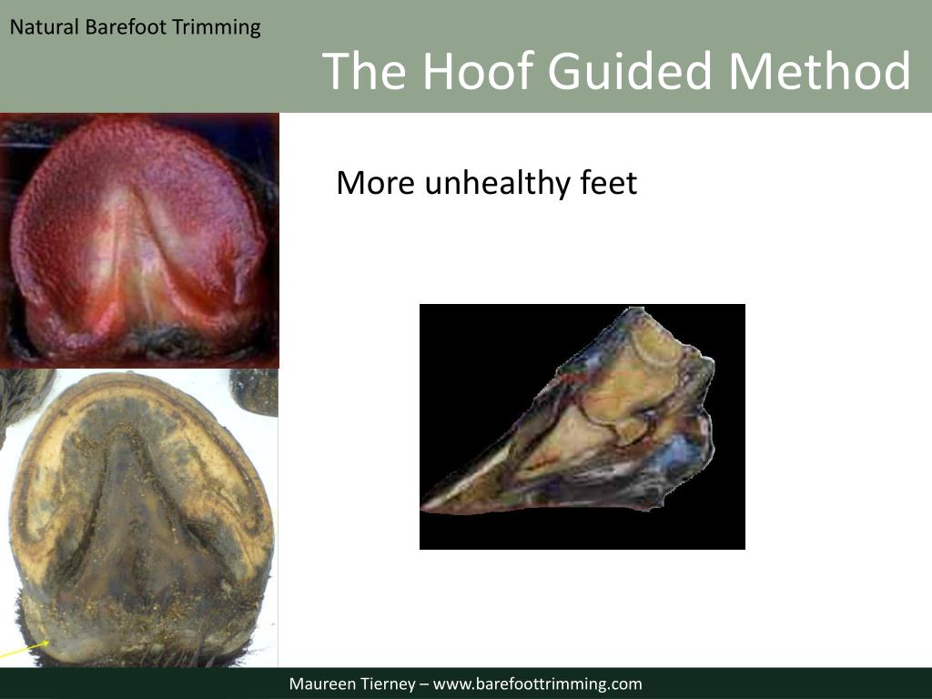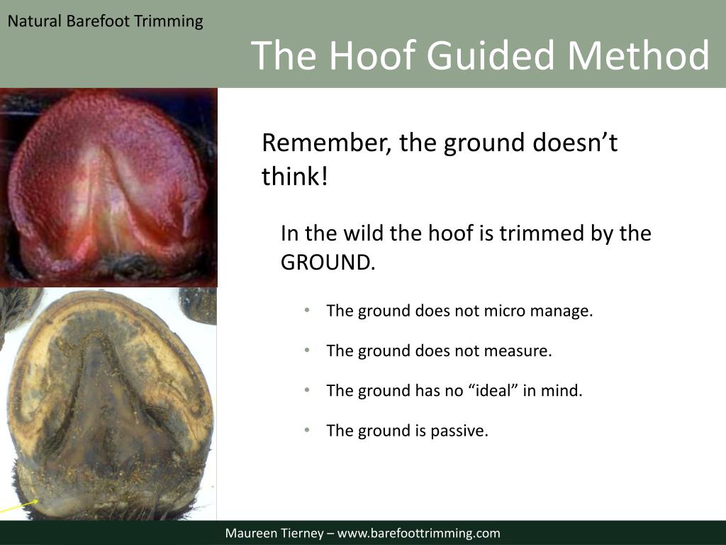 Natural Barefoot Trimming The Hoof Guided Method The hoof reacts to conditions – both external and internal The hoof is not static, it is DYNAMIC and can effect change in a very short amount of time, and in ways we would never imagine. Maureen Tierney – www.barefoottrimming.com