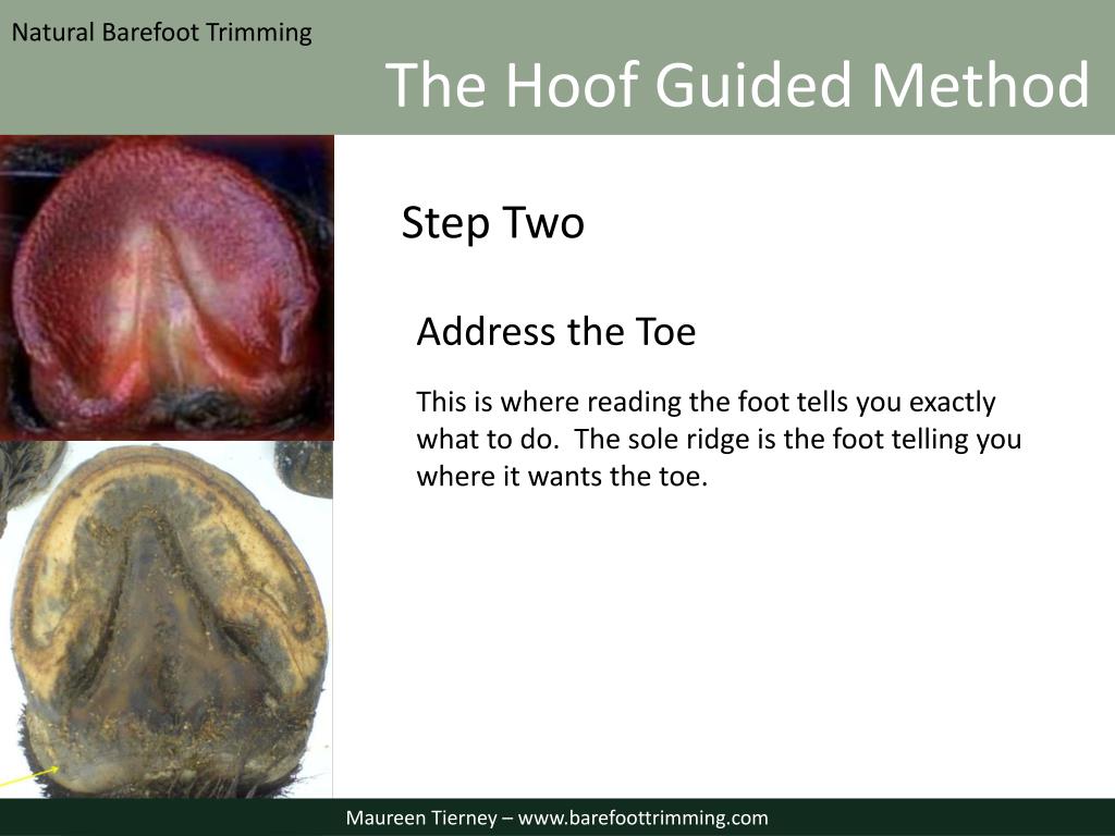 Natural Barefoot Trimming The Hoof Guided Method Step Two Address the Toe This is where reading the foot tells you exactly what to do. The sole ridge is the foot telling you where it wants the toe. Maureen Tierney – www.barefoottrimming.com