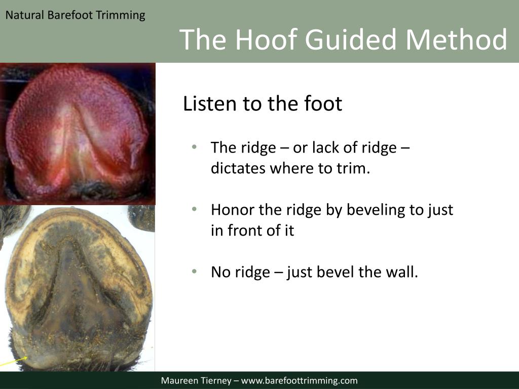 Natural Barefoot Trimming The Hoof Guided Method Listen to the foot • The ridge – or lack of ridge – dictates where to trim. • Honor the ridge by beveling to just in front of it • No ridge – just bevel the wall. Maureen Tierney – www.barefoottrimming.com