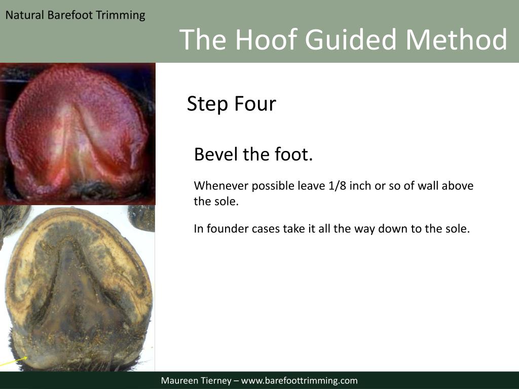 Natural Barefoot Trimming The Hoof Guided Method Step Four Bevel the foot. Whenever possible leave 1/8 inch or so of wall above the sole. In founder cases take it all the way down to the sole. Maureen Tierney – www.barefoottrimming.com
