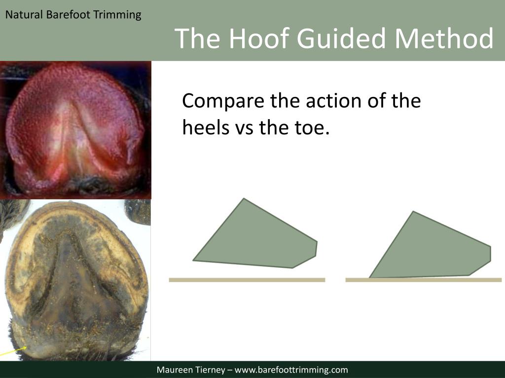 Natural Barefoot Trimming The Hoof Guided Method The heel lands and while the toe is being abraded, the heel is moving up. Maureen Tierney – www.barefoottrimming.com