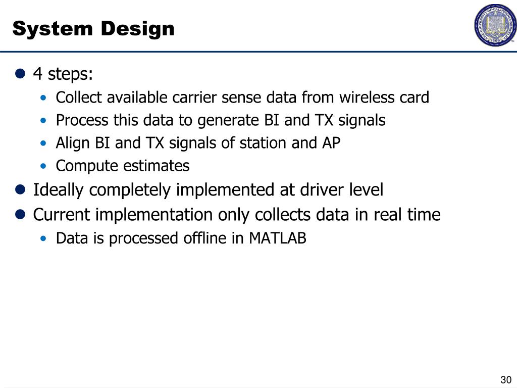 System Design • 4 steps: • Collect available carrier sense data from wireless card • Process this data to generate BI and TX signals • Align BI and TX signals of station and AP • Compute estimates • Ideally completely implemented at driver level • Current implementation only collects data in real time • Data is processed offline in MATLAB