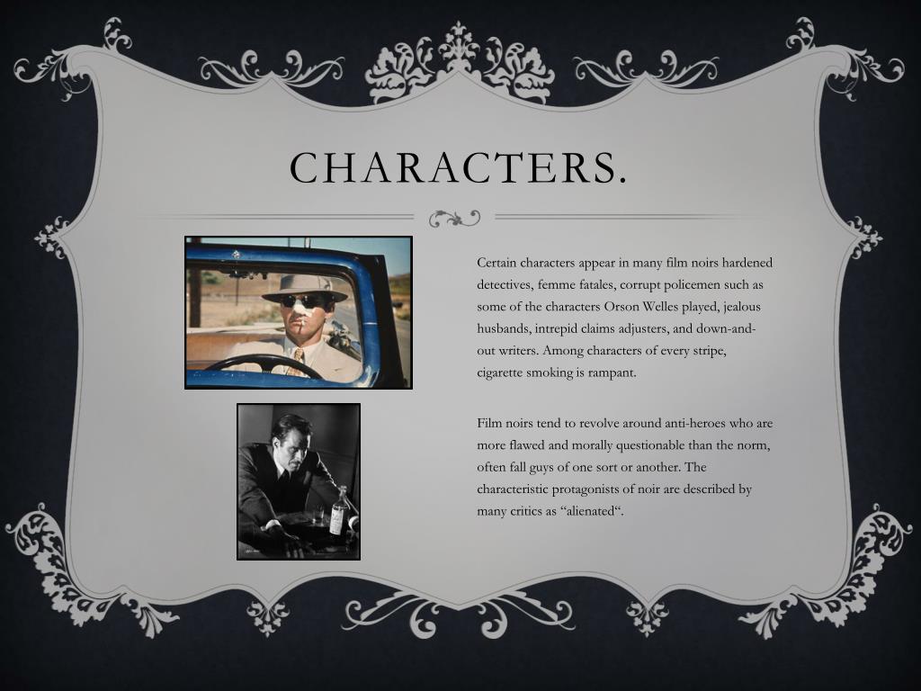 Characters. Certain characters appear in many film noirs hardened detectives, femme fatales, corrupt policemen such as some of the characters Orson Welles played, jealous husbands, intrepid claims adjusters, and down-and-out writers. Among characters of every stripe, cigarette smoking is rampant. Film noirs tend to revolve around anti-heroes who are more flawed and morally questionable than the norm, often fall guys of one sort or another. The characteristic protagonists of noir are described by many critics as “alienated“.