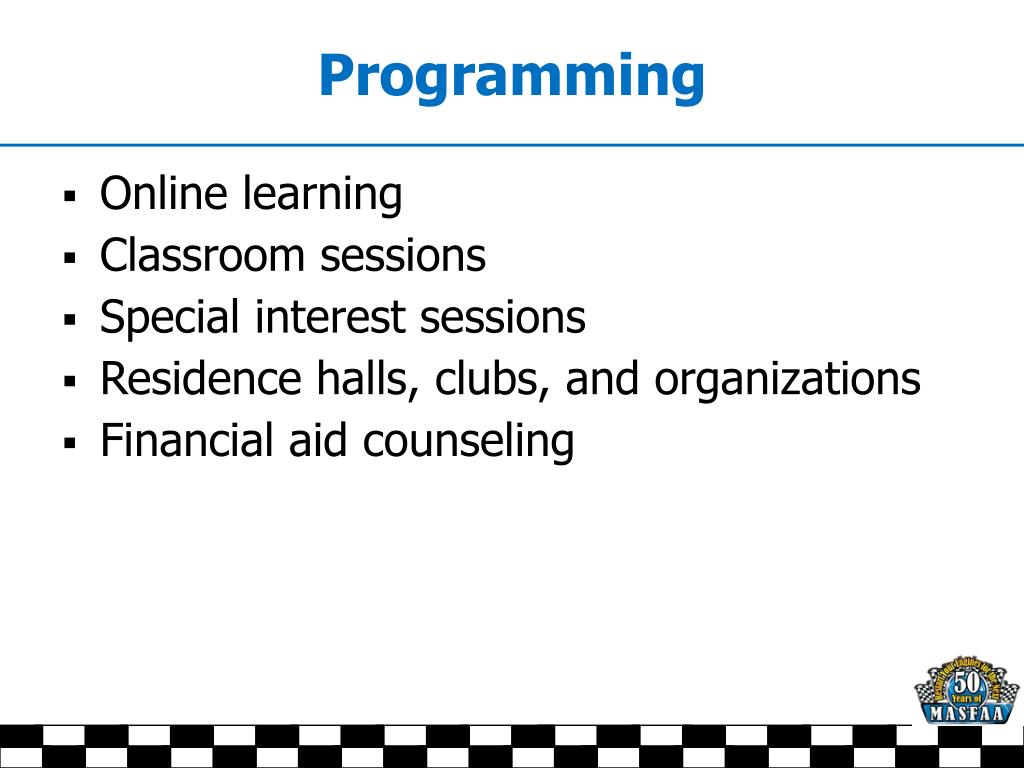 Programming • Online learning • Classroom sessions • Special interest sessions • Residence halls, clubs, and organizations • Financial aid counseling