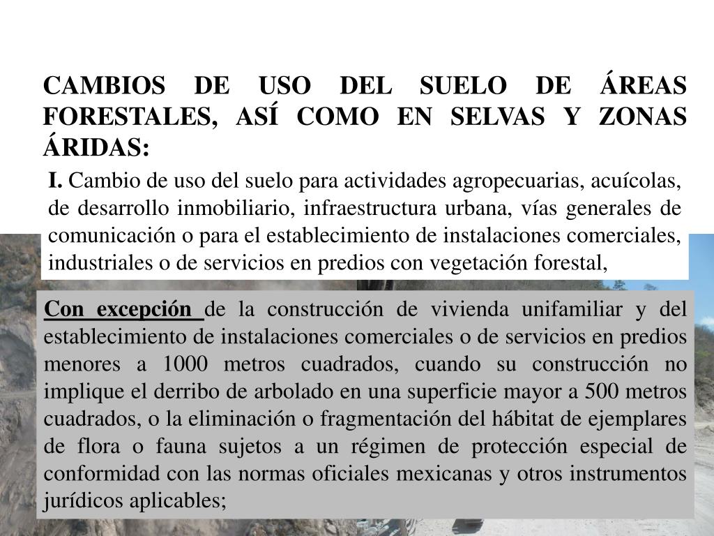 CAMBIOS DE USO DEL SUELO DE ÁREAS FORESTALES, ASÍ COMO EN SELVAS Y ZONAS ÁRIDAS: I. Cambio de uso del suelo para actividades agropecuarias, acuícolas, de desarrollo inmobiliario, infraestructura urbana, vías generales de comunicación o para el establecimiento de instalaciones comerciales, industriales o de servicios en predios con vegetación forestal, Con excepción de la construcción de vivienda unifamiliar y del establecimiento de instalaciones comerciales o de servicios en predios menores a 1000 metros cuadrados, cuando su construcción no implique el derribo de arbolado en una superficie mayor a 500 metros cuadrados, o la eliminación o fragmentación del hábitat de ejemplares de flora o fauna sujetos a un régimen de protección especial de conformidad con las normas oficiales mexicanas y otros instrumentos jurídicos aplicables;