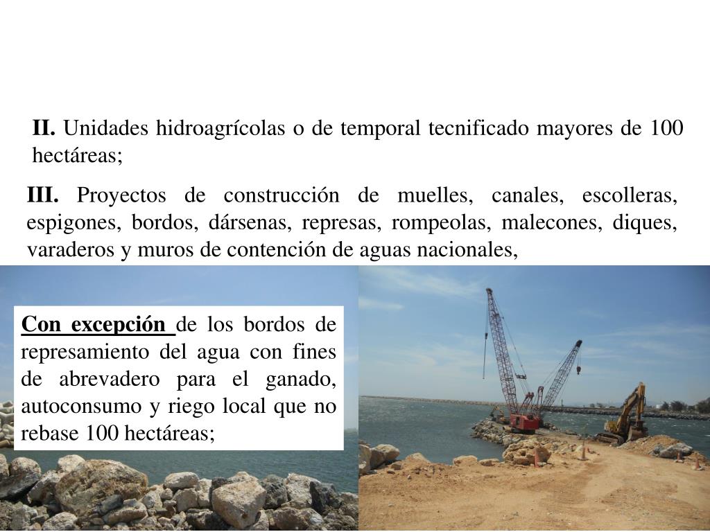 II. Unidades hidroagrícolas o de temporal tecnificado mayores de 100 hectáreas; III. Proyectos de construcción de muelles, canales, escolleras, espigones, bordos, dársenas, represas, rompeolas, malecones, diques, varaderos y muros de contención de aguas nacionales, Con excepción de los bordos de represamiento del agua con fines de abrevadero para el ganado, autoconsumo y riego local que no rebase 100 hectáreas;