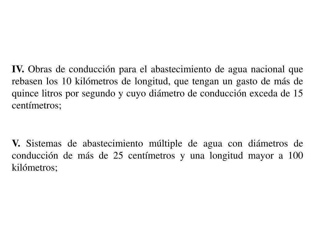 IV. Obras de conducción para el abastecimiento de agua nacional que rebasen los 10 kilómetros de longitud, que tengan un gasto de más de quince litros por segundo y cuyo diámetro de conducción exceda de 15 centímetros; V. Sistemas de abastecimiento múltiple de agua con diámetros de conducción de más de 25 centímetros y una longitud mayor a 100 kilómetros;