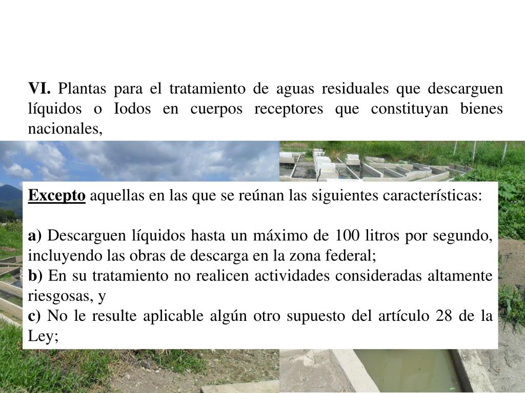 VI. Plantas para el tratamiento de aguas residuales que descarguen líquidos o Iodos en cuerpos receptores que constituyan bienes nacionales, Excepto aquellas en las que se reúnan las siguientes características: a) Descarguen líquidos hasta un máximo de 100 litros por segundo, incluyendo las obras de descarga en la zona federal; b) En su tratamiento no realicen actividades consideradas altamente riesgosas, y c) No le resulte aplicable algún otro supuesto del artículo 28 de la Ley;