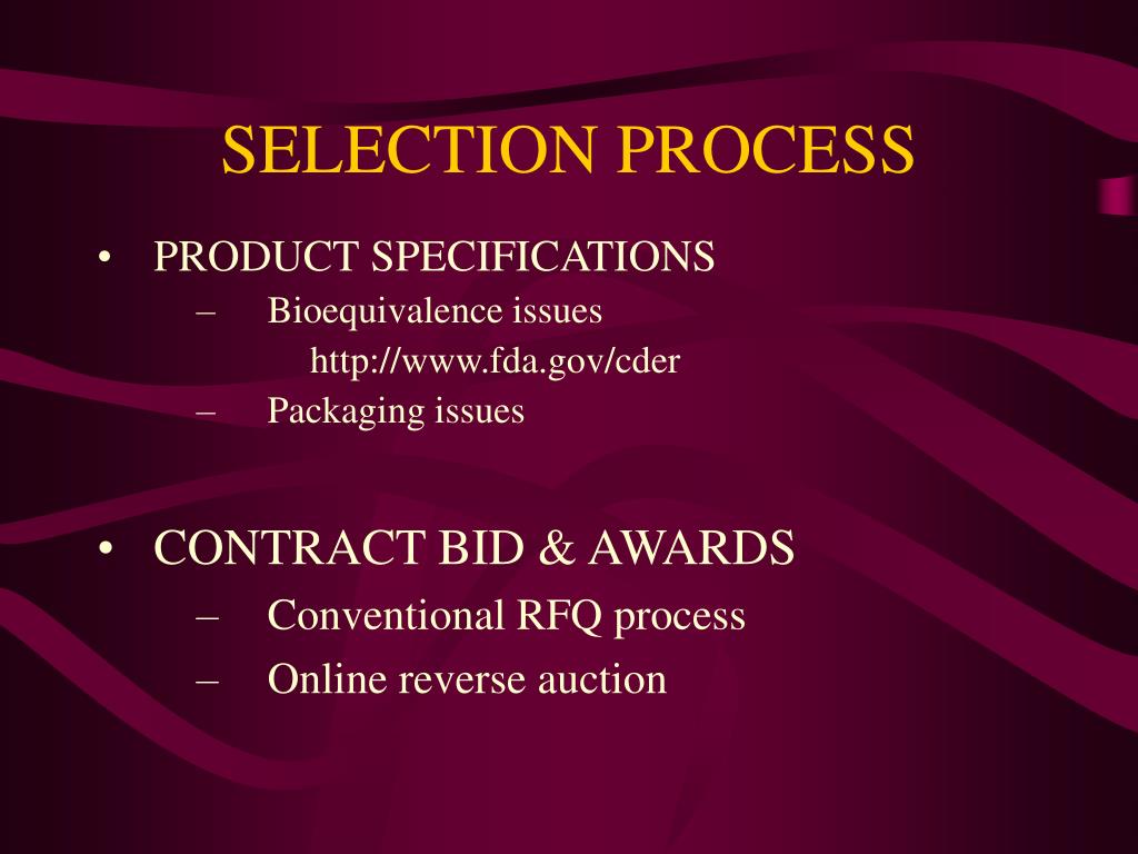 SELECTION PROCESS • PRODUCT SPECIFICATIONS • Bioequivalence issues http://www.fda.gov/cder • Packaging issues • CONTRACT BID & AWARDS • Conventional RFQ process • Online reverse auction