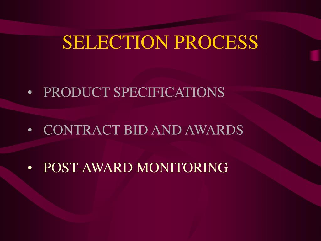 SELECTION PROCESS • PRODUCT SPECIFICATIONS • CONTRACT BID AND AWARDS • POST-AWARD MONITORING