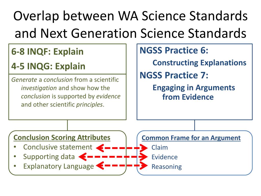 Overlap between WA Science Standards and Next Generation Science Standards 6-8 INQF: Explain 4-5 INQG: Explain NGSS Practice 6: Constructing Explanations NGSS Practice 7: Engaging in Arguments from Evidence Common Frame for an Argument Claim Evidence Reasoning Generate a conclusion from a scientific investigation and show how the conclusion is supported by evidence and other scientific principles. Conclusion Scoring Attributes • Conclusive statement • Supporting data • Explanatory Language