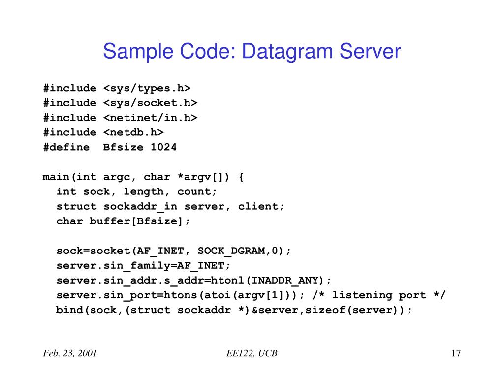 Sample Code: Datagram Server #include <sys/types.h> #include <sys/socket.h> #include <netinet/in.h> #include <netdb.h> #define Bfsize 1024 main(int argc, char *argv[]) { int sock, length, count; struct sockaddr_in server, client; char buffer[Bfsize]; sock=socket(AF_INET, SOCK_DGRAM,0); server.sin_family=AF_INET; server.sin_addr.s_addr=htonl(INADDR_ANY); server.sin_port=htons(atoi(argv[1])); /* listening port */ bind(sock,(struct sockaddr *)&server,sizeof(server)); EE122, UCB