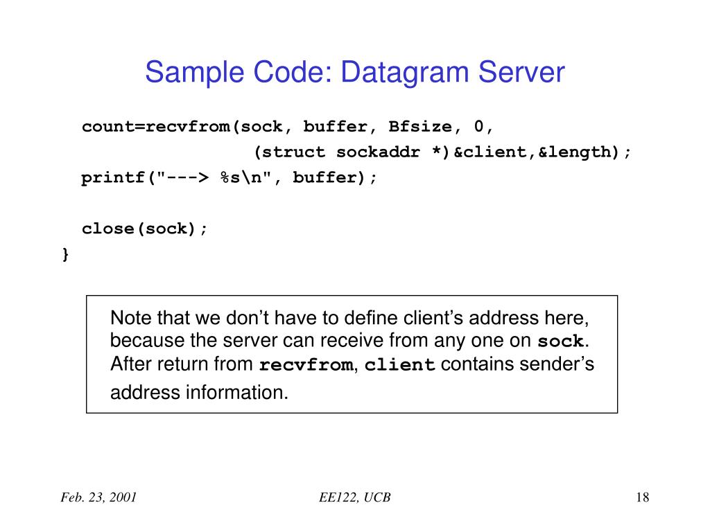 Note that we don’t have to define client’s address here, because the server can receive from any one on sock. After return from recvfrom, client contains sender’s address information. Sample Code: Datagram Server count=recvfrom(sock, buffer, Bfsize, 0, (struct sockaddr *)&client,&length); printf("---> %s\n", buffer); close(sock); } EE122, UCB